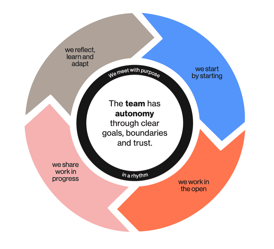 There is a strong bias for action. Work happens in short, focused sprints. Teams work in the open, sharing work-in-progress early and often and learning and iterating frequently.